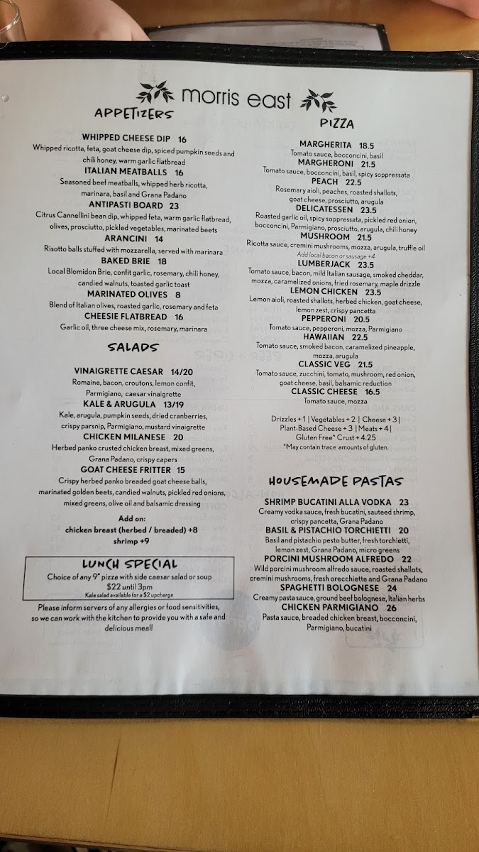 Morris East also boasts a delightful lunch special offering a Caesar salad and a 9-inch pizza for just $22, perfect for a midday treat. Families can enjoy their Family Combo Special, featuring a large salad and three pizzas, along with delicious desserts like salted caramel tart and lemon cheesecake—all for $95.